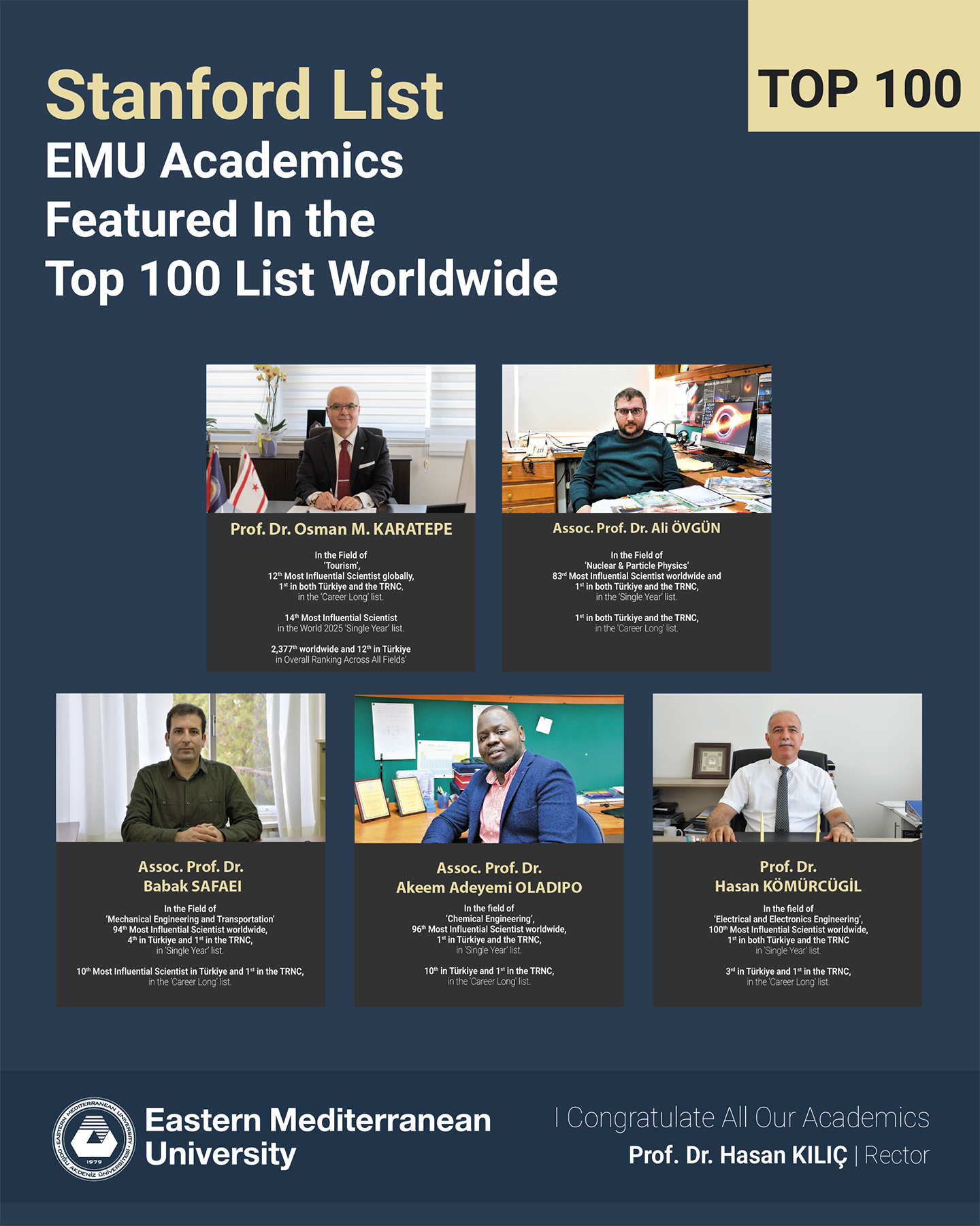 Prof. Dr. Osman M. Karatepe ranked 12th globally in ‘Tourism’ and 1st in both Türkiye and the TRNC. Prof. Dr. Salih T. Katırcıoğlu ranked 397th worldwide in ‘Economics’, also 1st in Türkiye and the TRNC. Prof. Dr. Nazım Mahmudov ranked 189th globally in ‘General Mathematics’, 3rd in Türkiye, and 1st in the TRNC. Prof. Dr. Hasan Kömürcügil ranked 199th worldwide in ‘Electrical and Electronics Engineering’, 3rd in Türkiye, and 1st in the TRNC. Assoc. Prof. Dr. Ali Övgün ranked 1,305th globally in ‘Nuclear & Particle Physics’, 1st in Türkiye and the TRNC. Assoc. Prof. Dr. Babak Safaei ranked 746th worldwide in ‘Mechanical Engineering and Transportation’, 10th in Türkiye, and 1st in the TRNC. Assoc. Prof. Dr. Akeem Adeyemi Oladipo ranked 658th globally in ‘Chemical Engineering’, 10th in Türkiye, and 1st in the TRNC. Prof. Dr. Osman Kükrer ranked 653rd worldwide in ‘Electrical and Electronics Engineering’, 7th in Türkiye, and 2nd in the TRNC. Prof. Dr. Hasan Demirel ranked 5,884th globally in ‘Artificial Intelligence and Image Processing’, 70th in Türkiye, and 2nd in the TRNC. Prof. Dr. İzzet Sakallı ranked 3,377th globally in ‘Nuclear & Particle Physics’, 14th in Türkiye, and 2nd in the TRNC. Former faculty member of Department of Electrical and Electronics Engineering Assoc. Prof. Dr. Kadri Hacıoğlu ranked 4,068th globally in ‘Network and Telecommunications’, 37th in Türkiye, and 2nd in the TRNC. Dr. Emad Sobhani ranked 1,318th worldwide in ‘Civil Engineering’, 29th in Türkiye, and 1st in the TRNC. Prof. Dr. Benedek Nagy ranked 9,677th globally in ‘Artificial Intelligence and Image Processing’, 122nd in Türkiye, and 3rd in the TRNC.